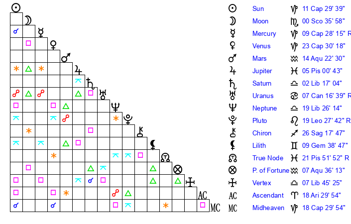 Moon | 0 Scorpio 42 | 17 Aquarius 5 | 17 Cancer 49 |
