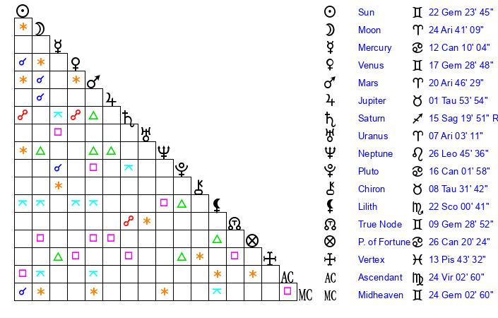 | Sun | 22 Gemini 24 | 22 Gemini 56 | 25 Virgo 31 |