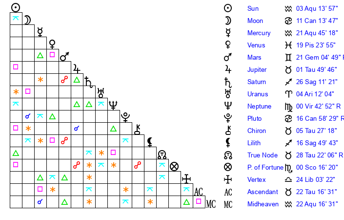 | Pluto | 16 Cancer 59 | 1 Aquarius 47 | 16 Cancer 24 |