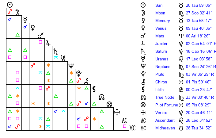 Moon | 27 Scorpio 32 | 10 Scorpio 19 | 23 Aries 52 |