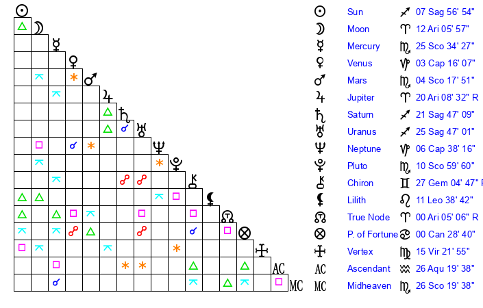 | Saturn | 21 Sagittarius 57 | 25 Pisces 4 | 26 Sagittarius 23 |