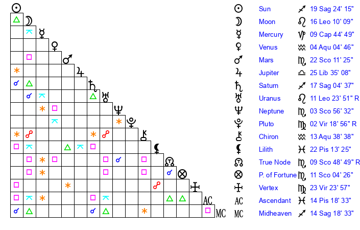 | Saturn | 17 Sagittarius 27 | 25 Pisces 13 | 24 Sagittarius 22 |