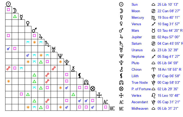 | Neptune | 5 Sagittarius 40 | 0 Aries 4 | 7 Sagittarius 32 |