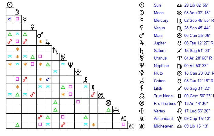 | Moon | 8 Aquarius 29 | 12 Scorpio 33 | 9 Virgo 29 |