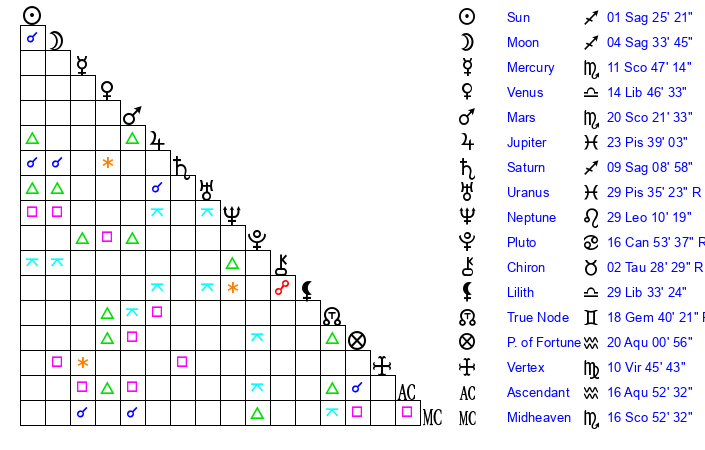 | Saturn | 9 Sagittarius 32 | 25 Pisces 4 | 18 Sagittarius 53 |