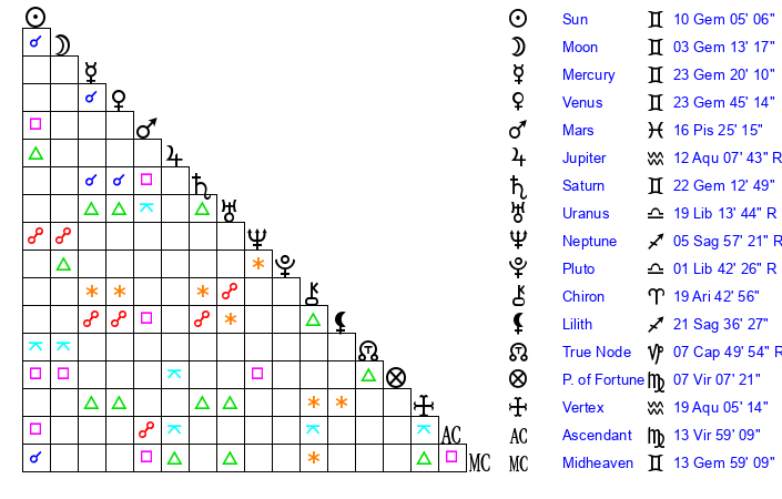 | Jupiter | 11 Aquarius 56 | 27 Gemini 56 | 8 Aquarius 0 |