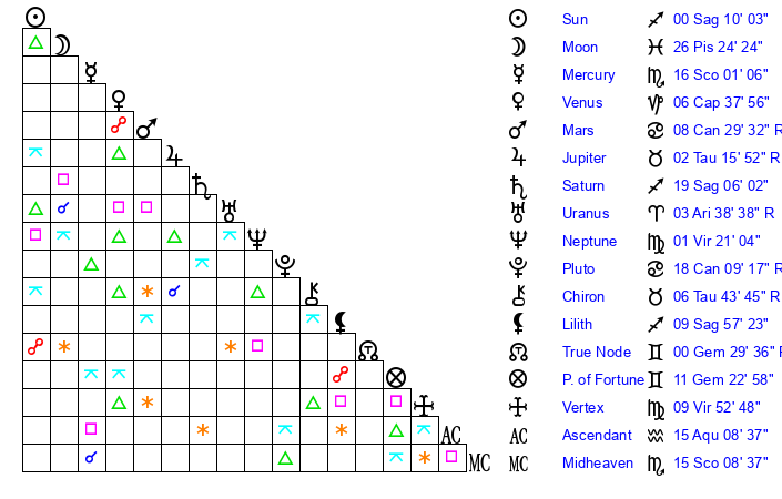 | Saturn | 19 Sagittarius 26 | 25 Pisces 5 | 29 Sagittarius 29 |