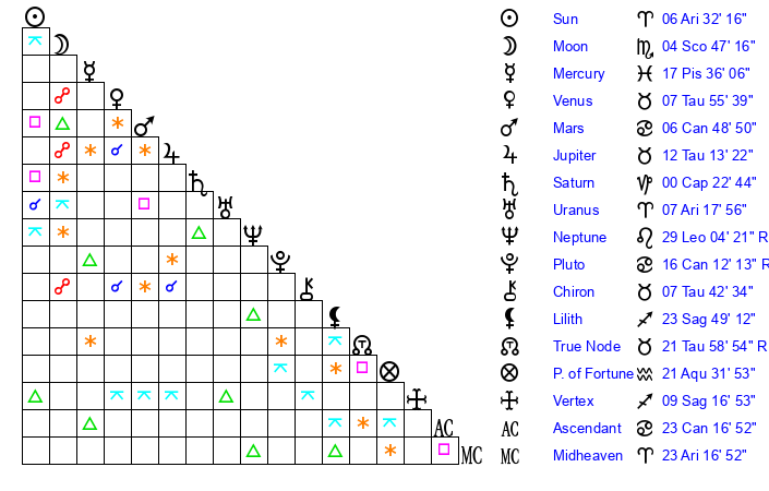 | Sun | 6 Aries 33 | 7 Aries 16 | 9 Cancer 20 |