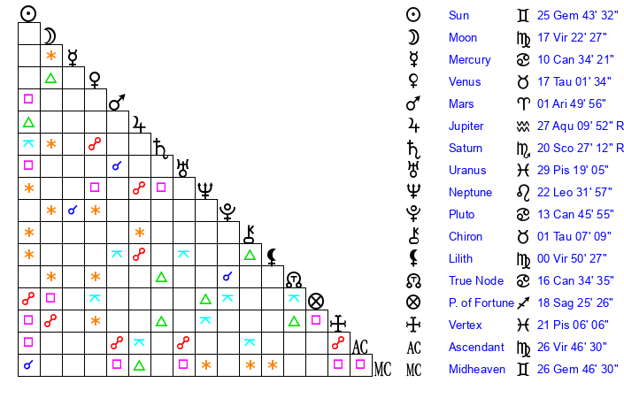 | Sun | 25 Gemini 43 | 26 Gemini 45 | 0 Libra 53 |