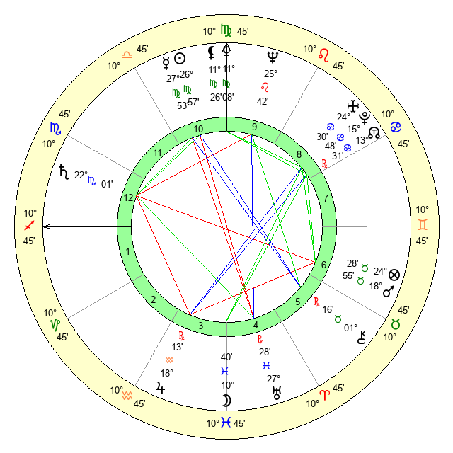 | Moon | 10 Pisces 43 | 14 Virgo 58 | 22 Libra 35 |