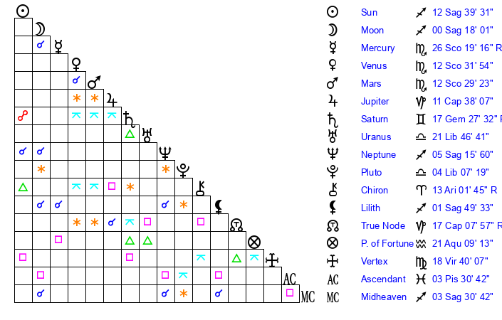 | Neptune | 5 Sagittarius 15 | 29 Pisces 22 | 6 Sagittarius 56 |