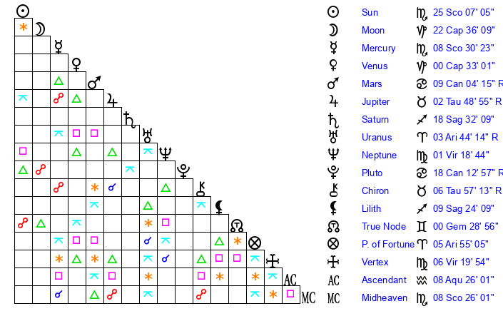 | Mercury | 8 Scorpio 31 | 1 Sagittarius 50 | 9 Aquarius 25 |