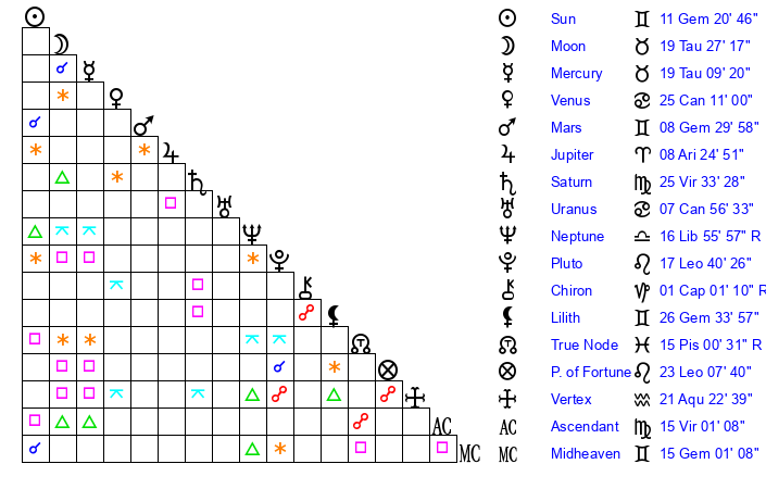 | Sun | 11 Gemini 20 | 12 Gemini 24 | 22 Leo 3 |