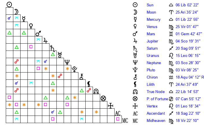| Moon | 25 Aries 36 | 3 Capricorn 34 | 4 Libra 29 |