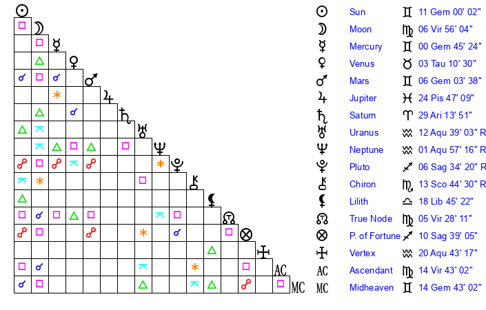 | Mercury | 0 Gemini 46 | 14 Gemini 36 | 26 Cancer 12 |
