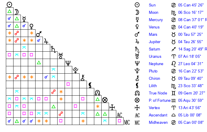 | Venus | 4 Cancer 41 | 22 Taurus 25 | 4 Scorpio 12 |