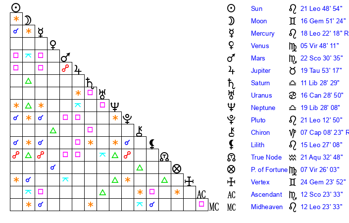 | Pluto | 21 Leo 13 | 2 Aquarius 6 | 23 Leo 4 |