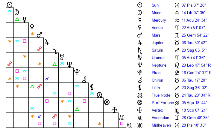 | Sun | 7 Pisces 38 | 8 Pisces 21 | 11 Gemini 39 |
