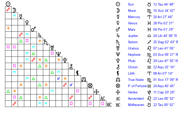 | Mars | 4 Pisces 52 | 6 Leo 51 | 22 Aries 30 |