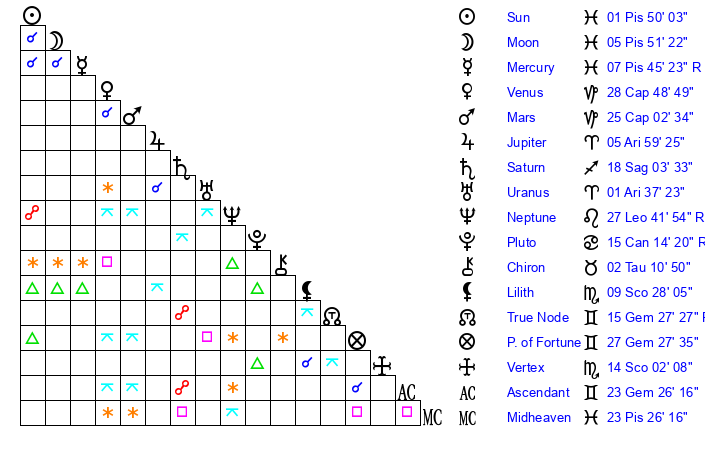 | Mercury | 7 Pisces 45 | 13 Pisces 21 | 29 Gemini 41 |