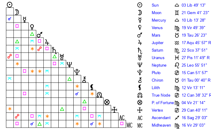 | Moon | 21 Gemini 45 | 9 Sagittarius 37 | 24 Capricorn 29 |