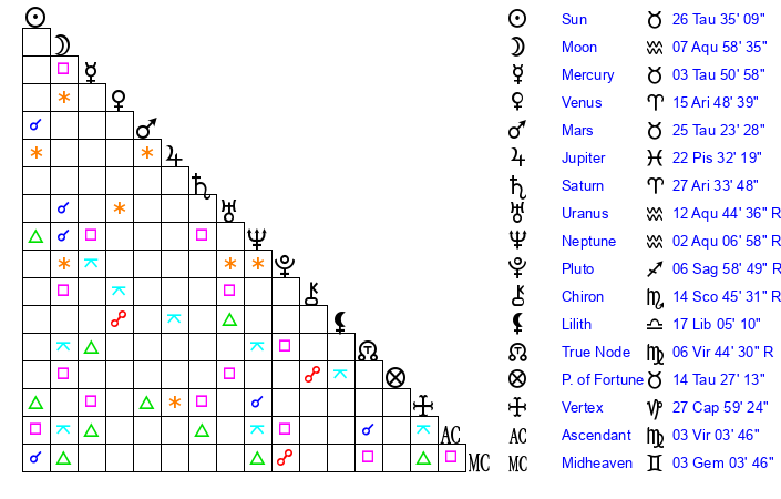 | Sun | 26 Taurus 35 | 27 Taurus 2 | 22 Gemini 29 |