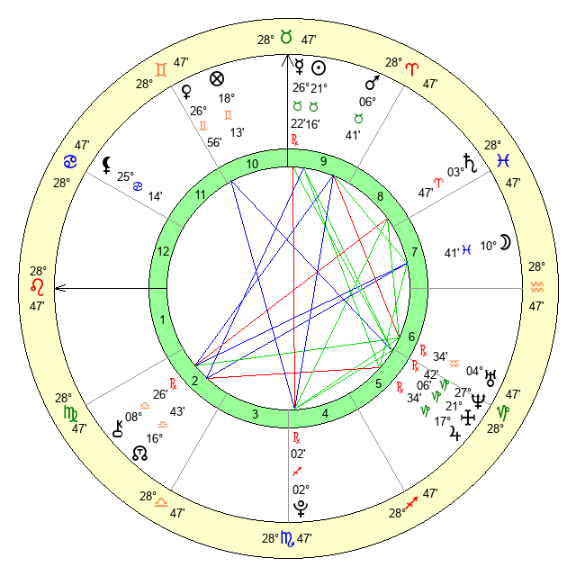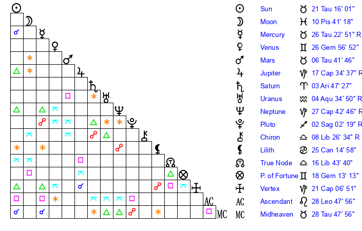 | Mars | 6 Taurus 42 | 10 Leo 40 | 27 Taurus 55 |