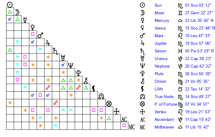 | Venus | 15 Scorpio 23 | 13 Libra 27 | 2 Scorpio 30 |