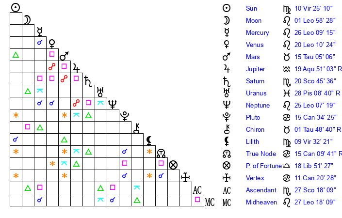 | Mercury | 26 Leo 10 | 2 Virgo 12 | 28 Scorpio 2 |