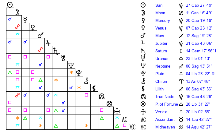 | Sun | 27 Capricorn 27 | 27 Capricorn 50 | 19 Pisces 59 |