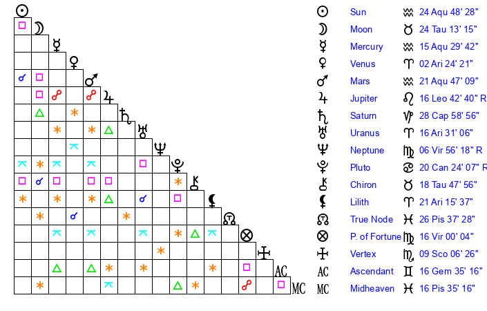 | Sun | 24 Aquarius 48 | 26 Aquarius 15 | 26 Taurus 33 |