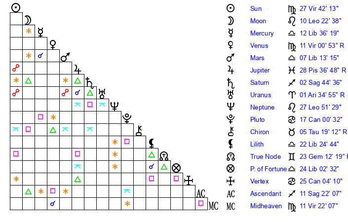 | Venus | 11 Virgo 0 | 2 Virgo 40 | 22 Scorpio 37 |