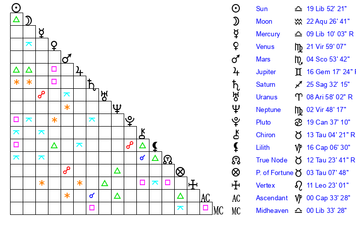 | Sun | 19 Libra 52 | 20 Libra 36 | 26 Capricorn 53 |