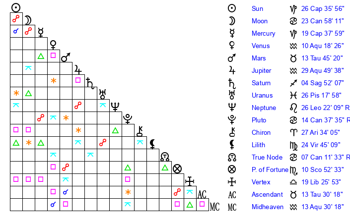 | Sun | 26 Capricorn 36 | 27 Capricorn 50 | 4 Taurus 29 |