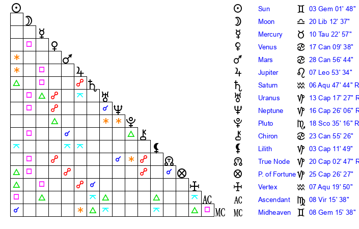| Moon | 20 Libra 9 | 29 Aries 41 | 11 Capricorn 52 |