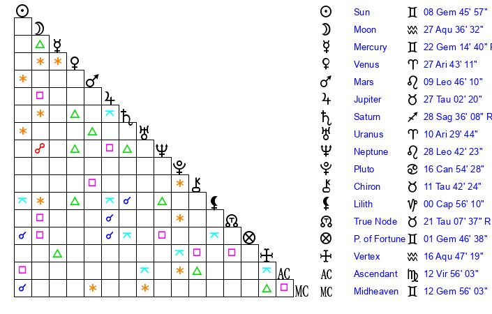 | Moon | 27 Aquarius 25 | 28 Cancer 11 | 13 Virgo 32 |