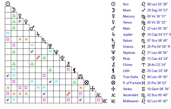| Moon | 29 Sagittarius 31 | 11 Scorpio 41 | 28 Leo 25 |