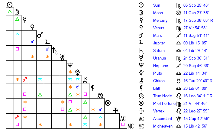 | Sun | 5 Scorpio 26 | 5 Scorpio 31 | 20 Sagittarius 50 |