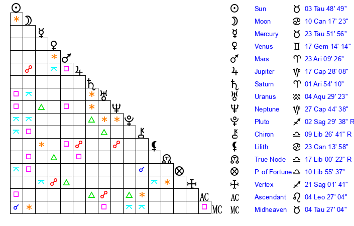 Mercury | 23 Taurus 51 | 6 Aries 36 | 20 Taurus 33 |