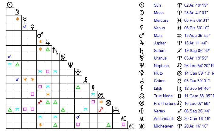 | Sun | 2 Aries 49 | 3 Aries 19 | 6 Cancer 42 |