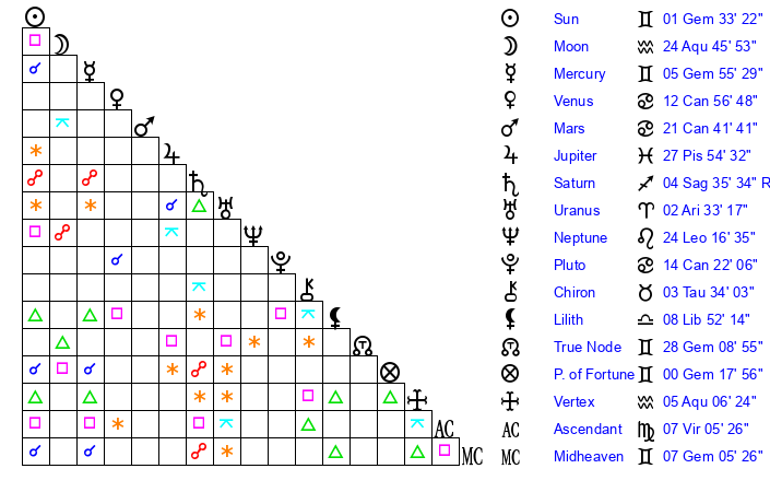 | Pluto | 14 Cancer 23 | 3 Aquarius 43 | 16 Cancer 41 |