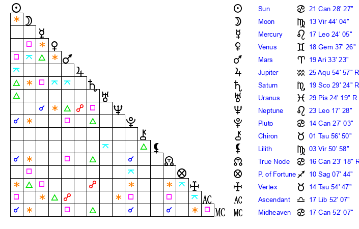 | Moon | 13 Virgo 43 | 9 Pisces 42 | 4 Taurus 16 |