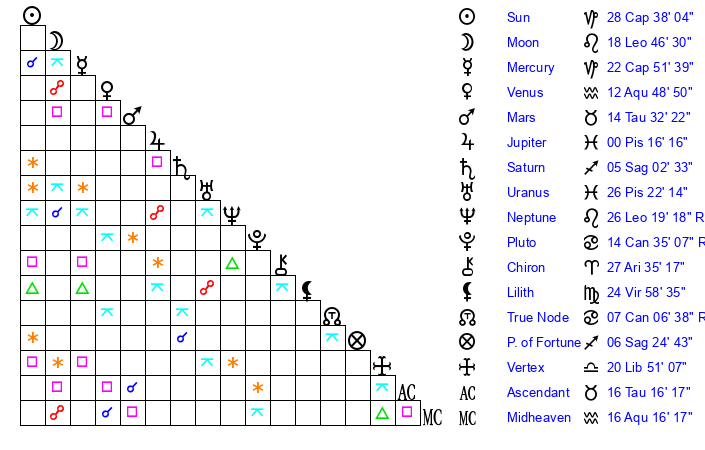 | Sun | 28 Capricorn 38 | 29 Capricorn 52 | 6 Taurus 26 |