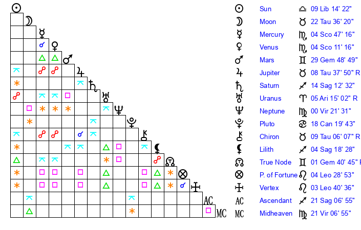| Moon | 22 Taurus 22 | 11 Aquarius 25 | 10 Sagittarius 50 |