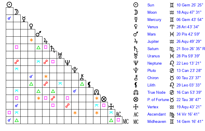 | Jupiter | 26 Aquarius 43 | 28 Gemini 10 | 19 Aquarius 11 |