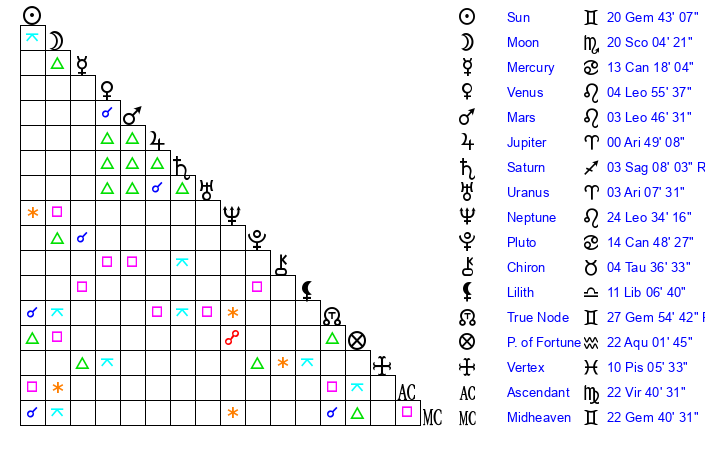 | Sun | 20 Gemini 43 | 21 Gemini 58 | 24 Virgo 46 |