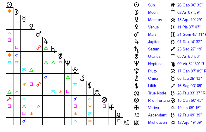 | Sun | 26 Capricorn 7 | 26 Capricorn 49 | 2 Taurus 4 |