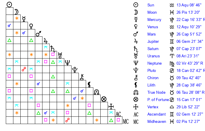 | Sun | 13 Aquarius 9 | 14 Aquarius 6 | 17 Taurus 22 |