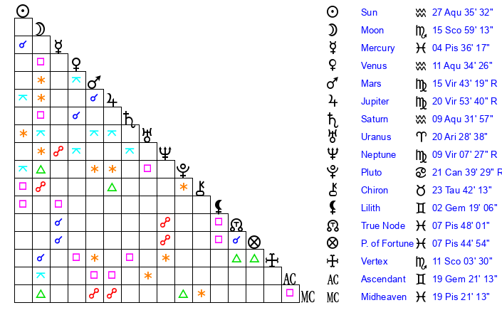 | Neptune | 9 Virgo 7 | 28 Pisces 27 | 7 Virgo 23 |