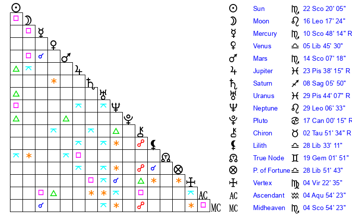 | Neptune | 29 Leo 7 | 29 Pisces 32 | 27 Leo 42 |